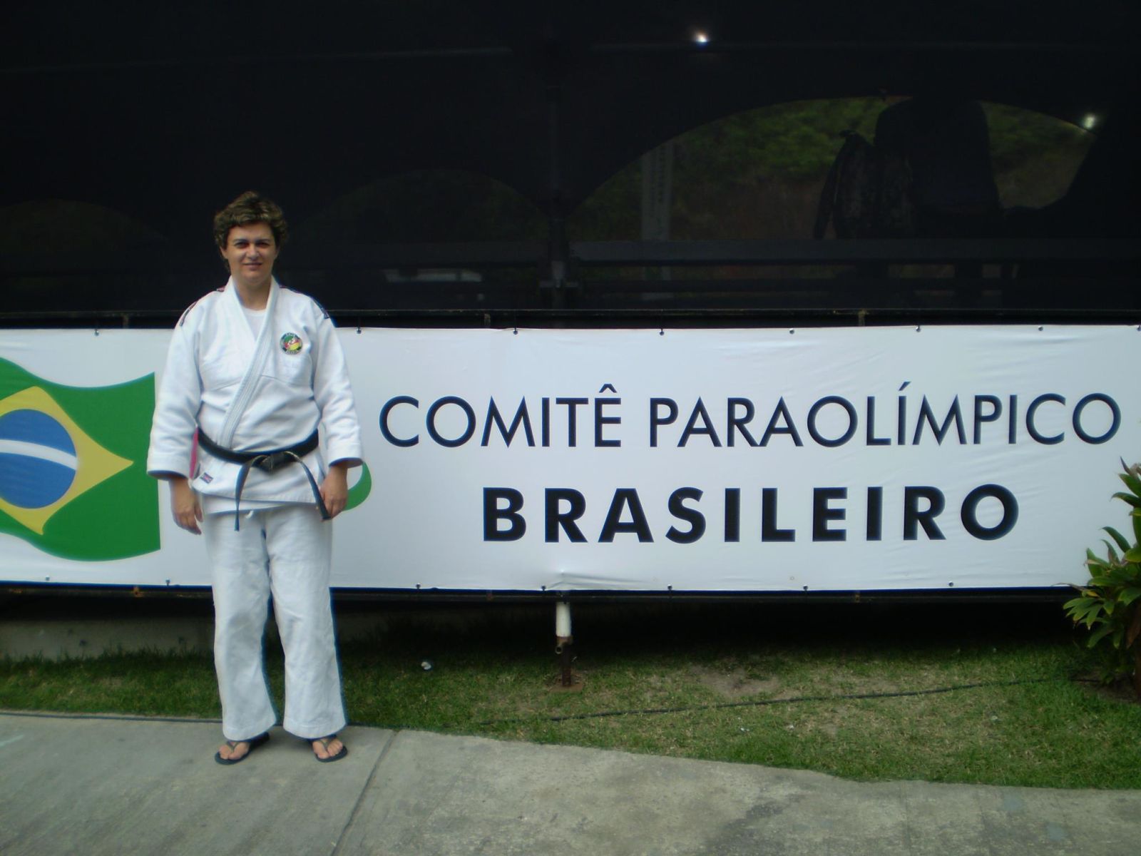 Texto alternativo: Foto de Giovana Pilla, mulher branca de cabelos curtos, de pé, usando traje de judô, todo branco com a faixa preta e chinelos de dedo, em frente a faixa escrito Comitê Paralímpico Brasileiro.